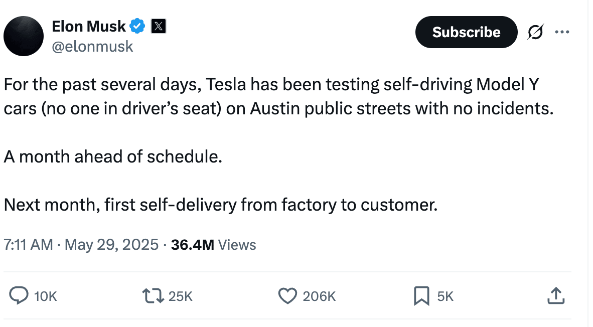 "Next month, first self-delivery from factory to customer," Musk recently announced, confirming tests of driverless Model Y vehicles in Austin.