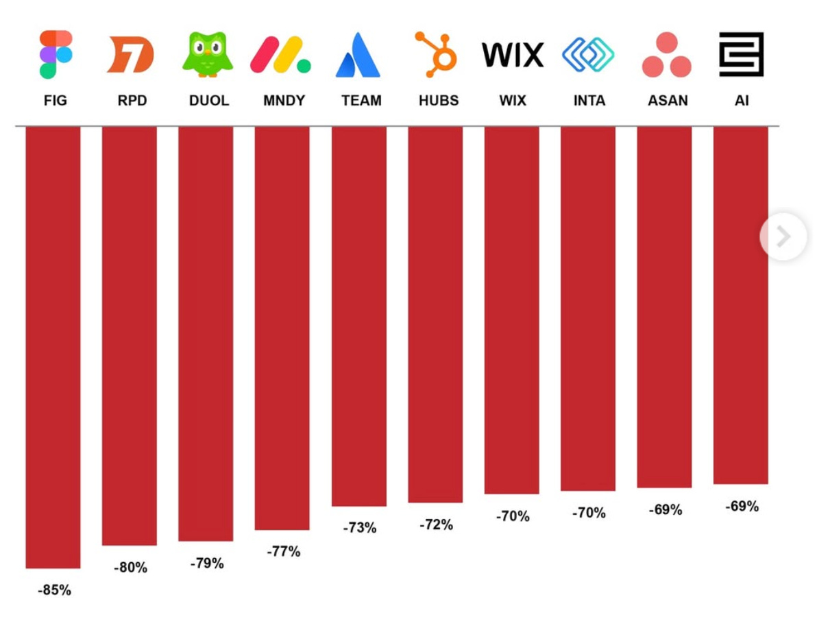 Chegg (CHGG). The original canary. A company that sold textbook answers and homework help at the price of a monthly subscription. The stock has fallen from over one hundred dollars to below one dollar. There is no pivot available. The product was the answer. The answer is now free.