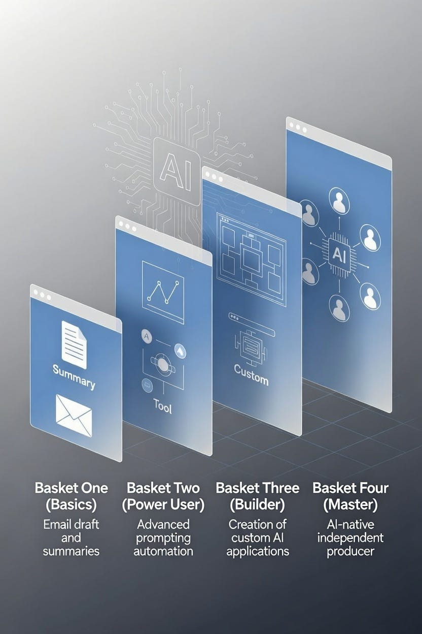 Basket One: The Basics. Using AI for summaries, research, draft emails. Most people who use AI at all are here. It saves time. But as a competitive differentiator, it is rapidly approaching zero. If everyone can summarise a document with a chatbot, doing it with a chatbot confers no advantage. These skills are being commoditised in real time.
