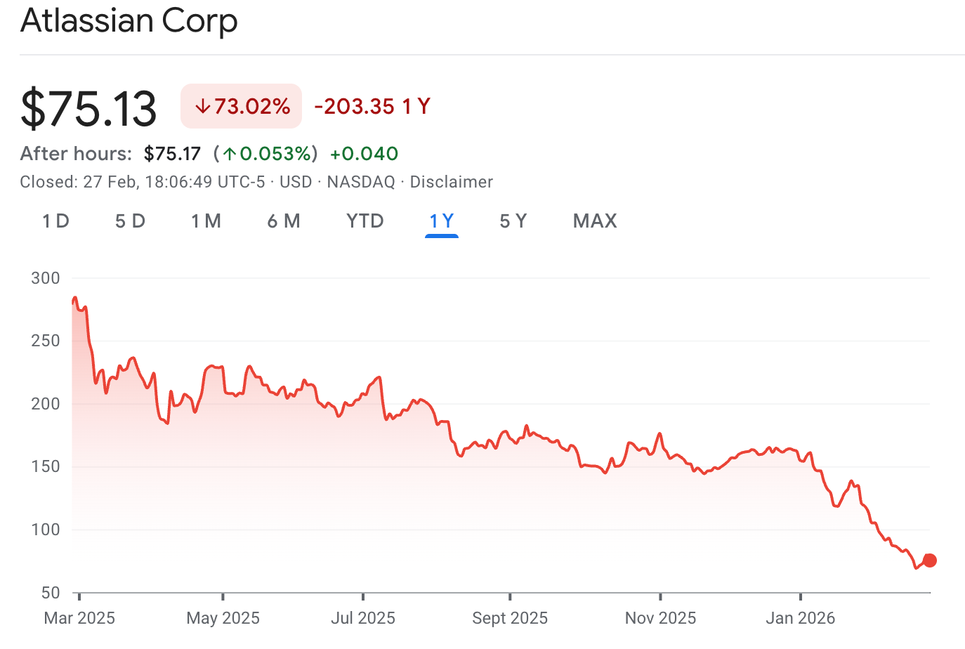 Over the past fifty-two weeks, Atlassian has been widely reported as down roughly 73%, trading near levels last seen in 2018.