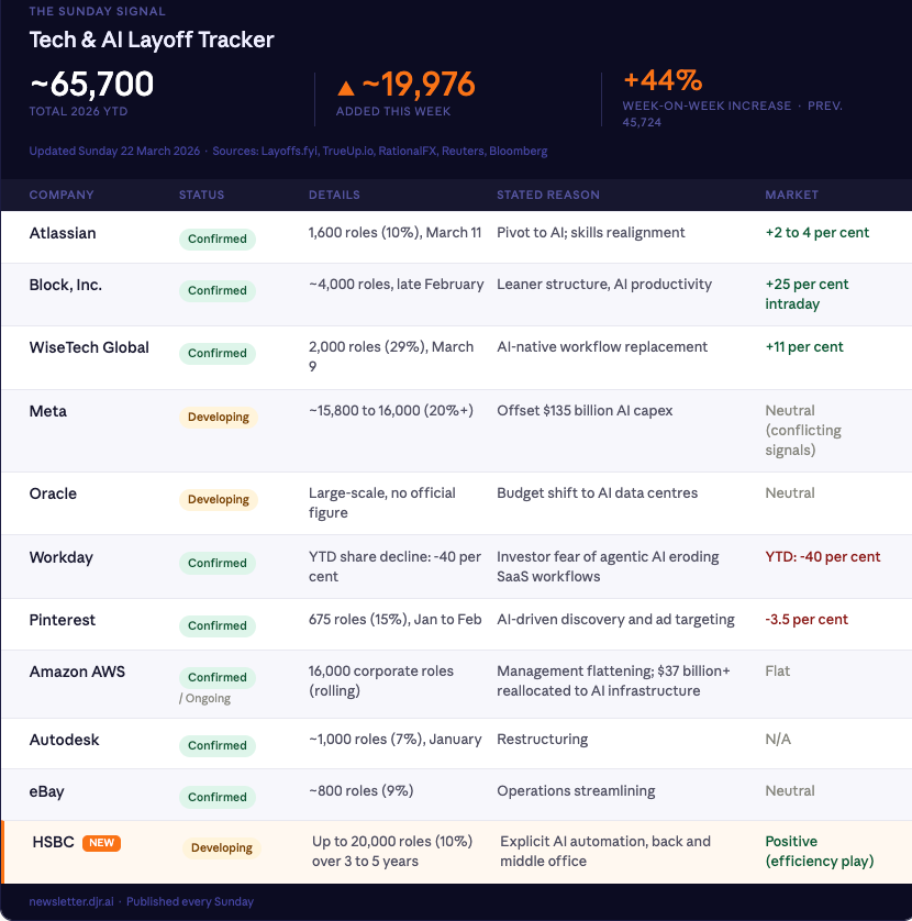 Up from 45,724 as of 14 March. The most significant new entry this week is HSBC, which disclosed plans to reduce its workforce by up to 20,000 roles, explicitly citing AI automation in back and middle office functions. This is the first globally systemically important bank to name AI as the mechanism of reduction in formal planning documents. It will not be the last.