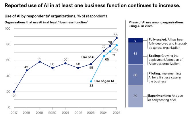 Artificial intelligence has moved from novelty to necessity. The latest McKinsey Global Survey on AI finds that almost all organisations now use AI in at least one function, yet most are still short of enterprise scale. Reported regular use is widespread, but only about a third have moved beyond pilots into scaling across the business.