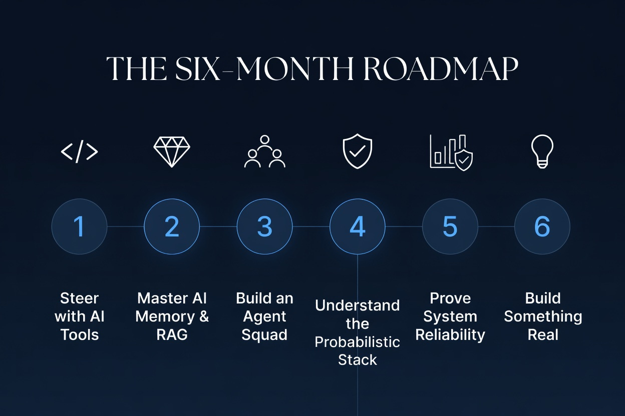 Month five: understand the probabilistic stack. Token cost, latency, agentic observability. These are systems that do not behave the same way twice. Learning to run them in production is where most people stop. Do not stop.