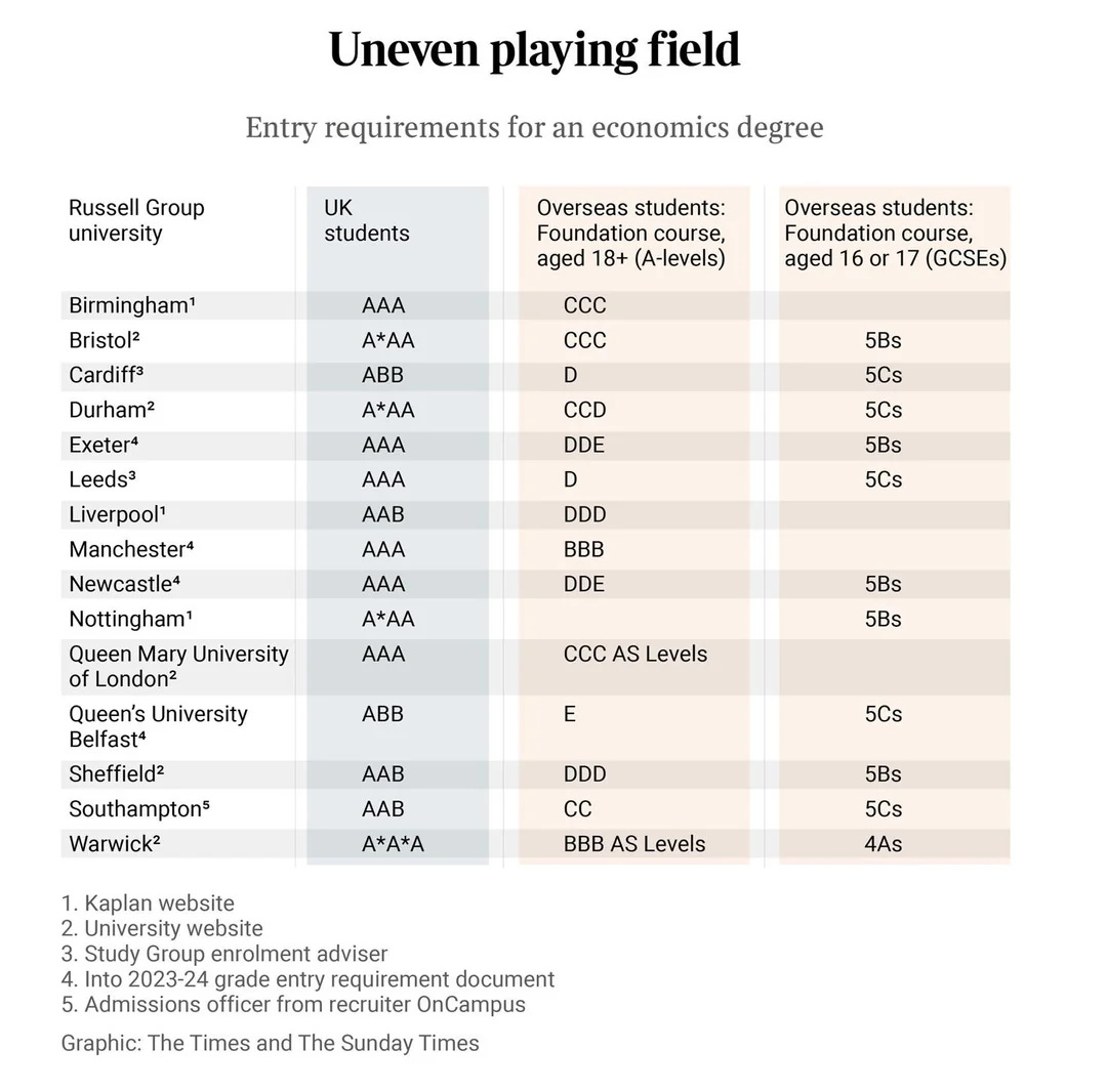 The numbers tell the story more clearly than any speech can. Russell Group universities demand top A-level grades from British students, often A or A*, while admitting overseas students to the same courses with far lower requirements. For economics, Birmingham asks AAA from UK students but CCC from international ones. Leeds requires AAA at home and a single D abroad. At Sheffield and Liverpool, some overseas entrants are accepted with DDD or even E grades. This is not a gap in ability. It is a gap created by economics. Home fees are capped. International fees are not. The pressure to plug funding holes has turned equality of entry into a luxury the system no longer affords. When grades are adjusted to match cashflow, education stops being a level field. It becomes a marketplace.