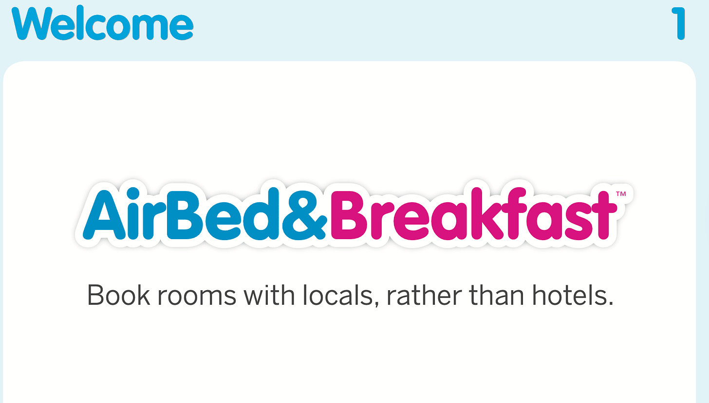 AirBed & Breakfast. The opening line is disarming in its plainness: book rooms with locals rather than hotels. Three screens show search, review and book. A scrappy adoption plan piggybacks on big events. It is not polished. It is focused. The result was a seed round of roughly $600,000 in 2009 from Sequoia Capital and Y Ventures, after a tiny Y Combinator cheque.