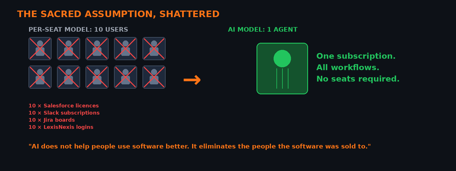 If one agent can do the work of ten junior associates, you do not need ten seats. You need one. And when users disappear, the software attached to them disappears too. This is not efficiency. It is revenue collapse. It is the difference between a company that grows because its customers hire more people and a company that watches its addressable market shrink every time AI improves.